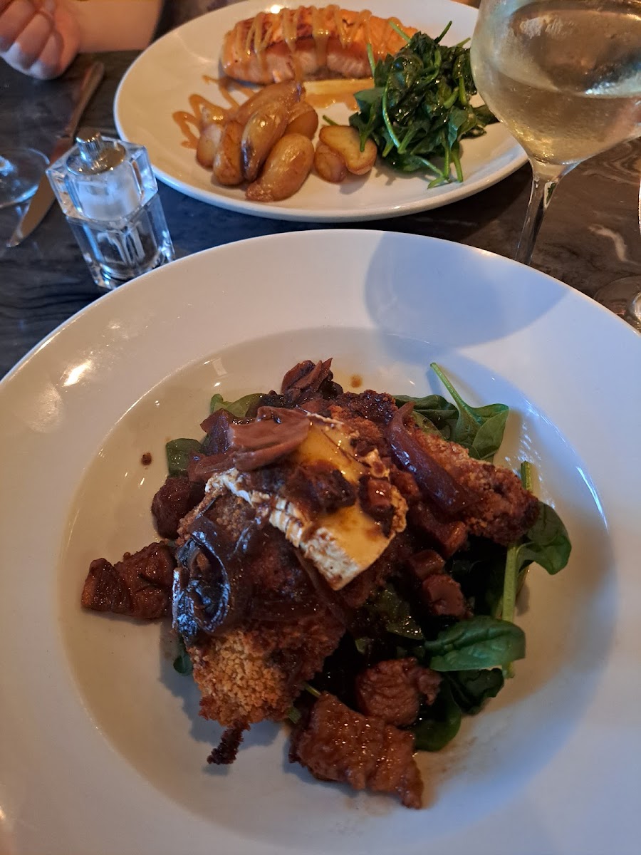 - Crispy Brie Stuffed Chicken featuring a baby spinach salad crowned with warm bacon, mushroom, and onion, a delightful option that surely will impress.
