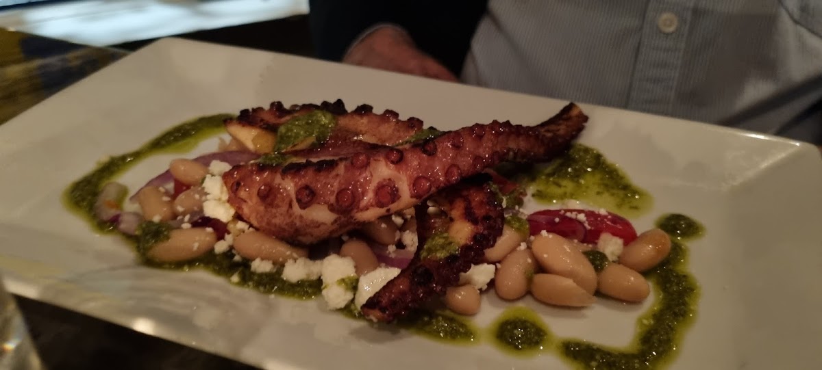 - Tempura Calamari drizzled with sweet chili and Sriracha aioli, served over a mixed green salad, a steal at $17.50.